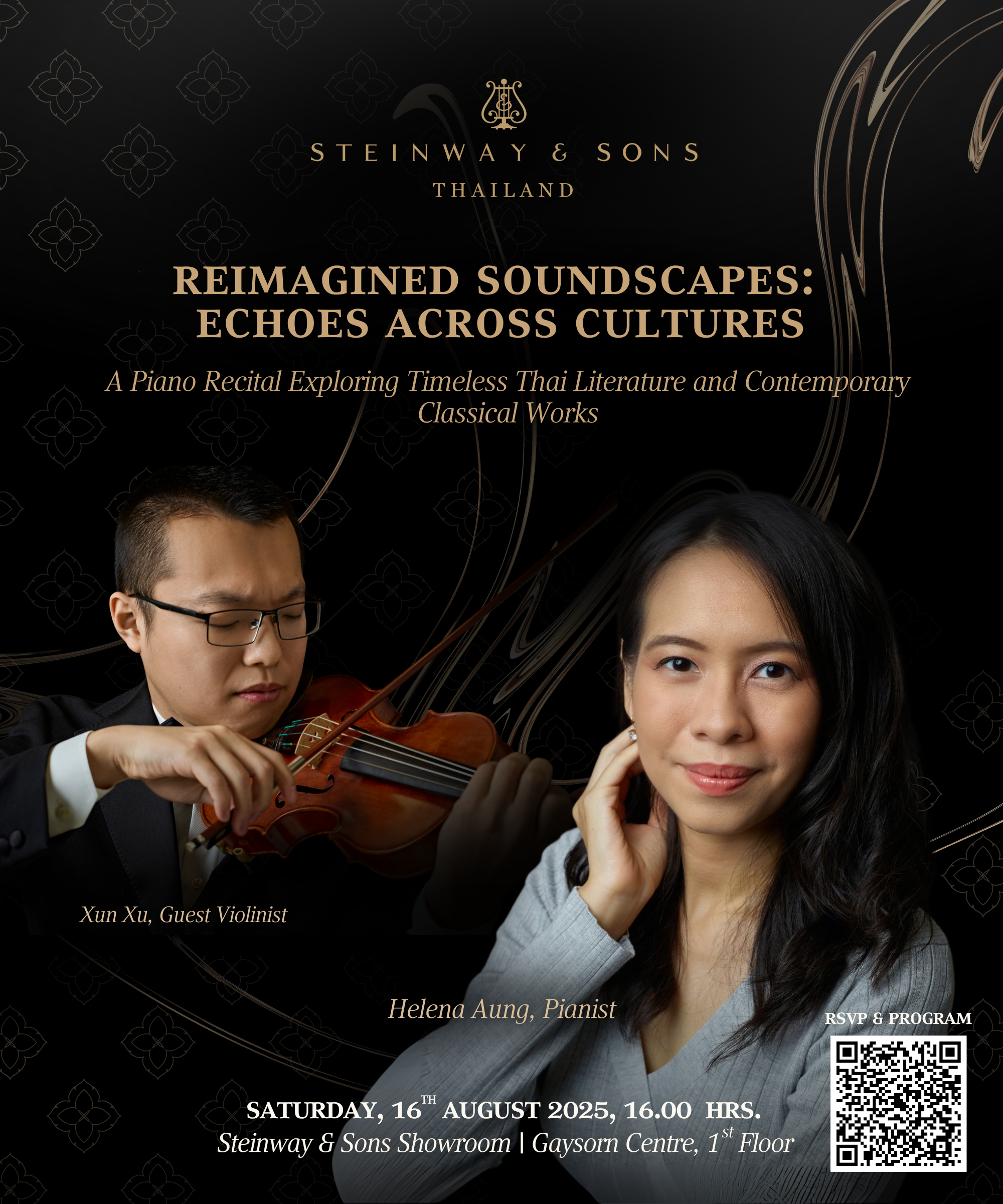 Steinway Thailand is delighted to present an evocative piano recital by accomplished pedagogue and pianist, Helena Aung. Titled Reimagined Soundscapes: Echoes Across Cultures, this recital weaves together musical interpretations of the timeless literature “Phra Abai Mani” penned by the legendary Thai Poet Sunthorn Phu — The Bard of Rattanakosin, and “I-Nao”, a story of love and complexity of human adapted from the Javanese tales and majestically re-imagined to theatrical script by H.M. King Rama II. This program also features contemporary classical works by Martin Bresnick, with guest artist Xun Xu on Violin.