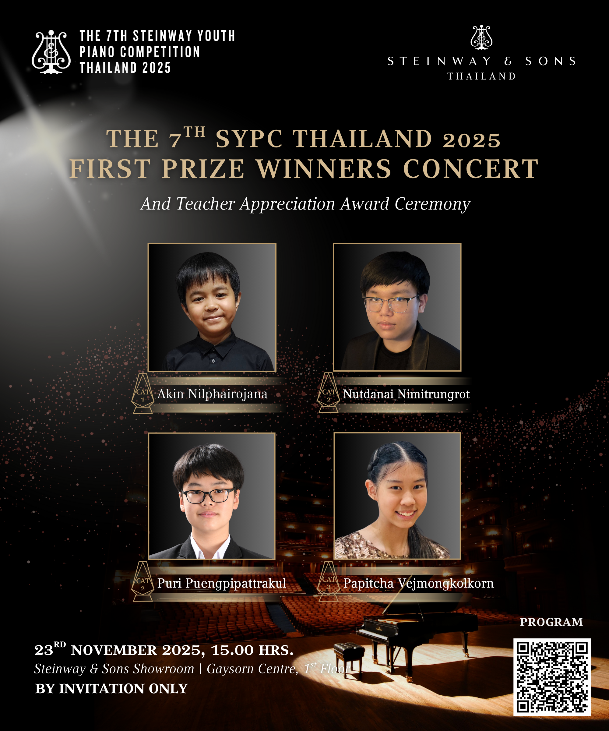 The winners from each category: Akin Nilphairojana (Category 1), Nutdanai Nimitrungrot and Puri Puengpipattrakul (Category 2 Joint-Winners), and Papitcha Vejmongkolkorn (Category 3), will celebrate their achievements on the prestigious Steinway & Sons stage.