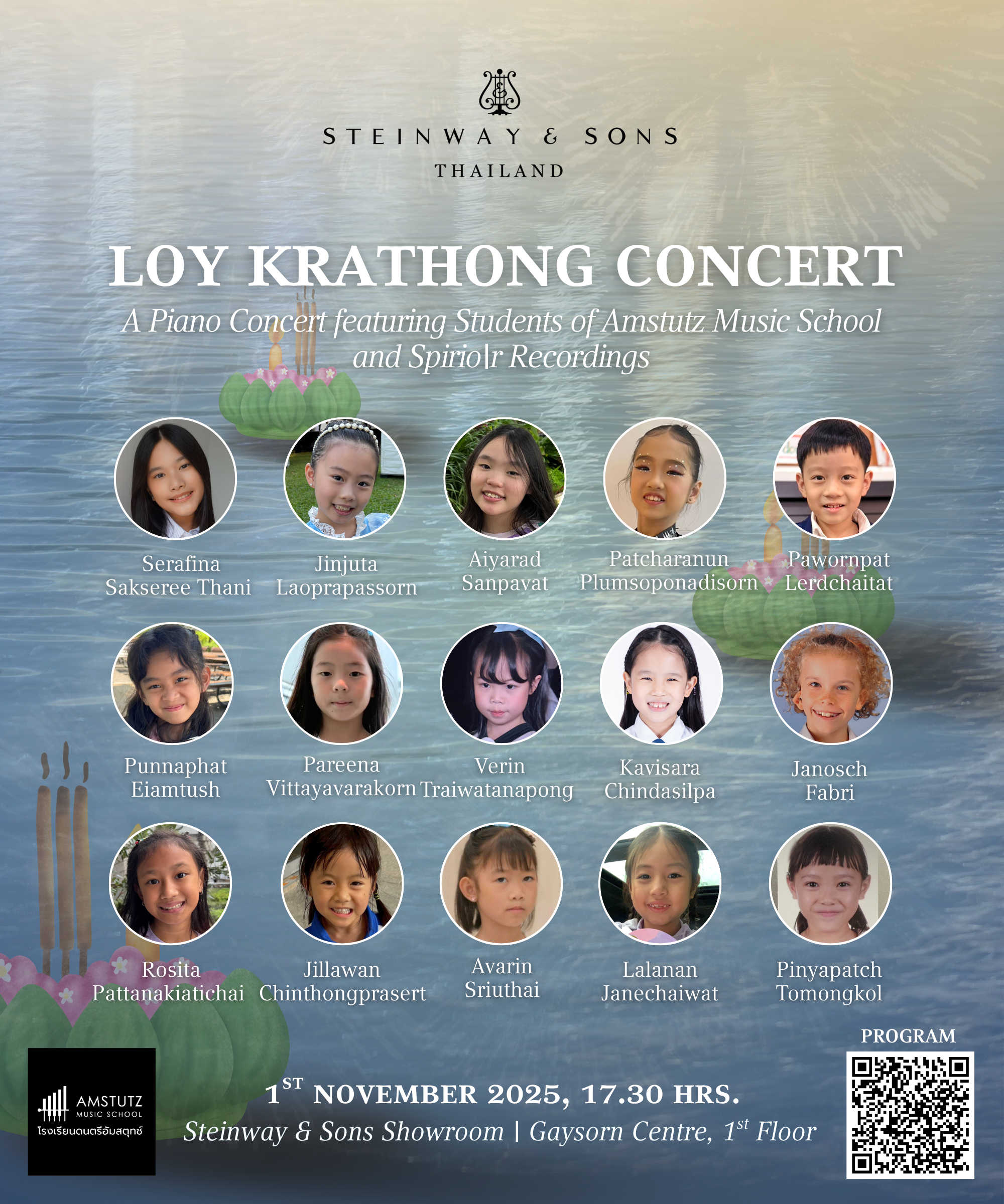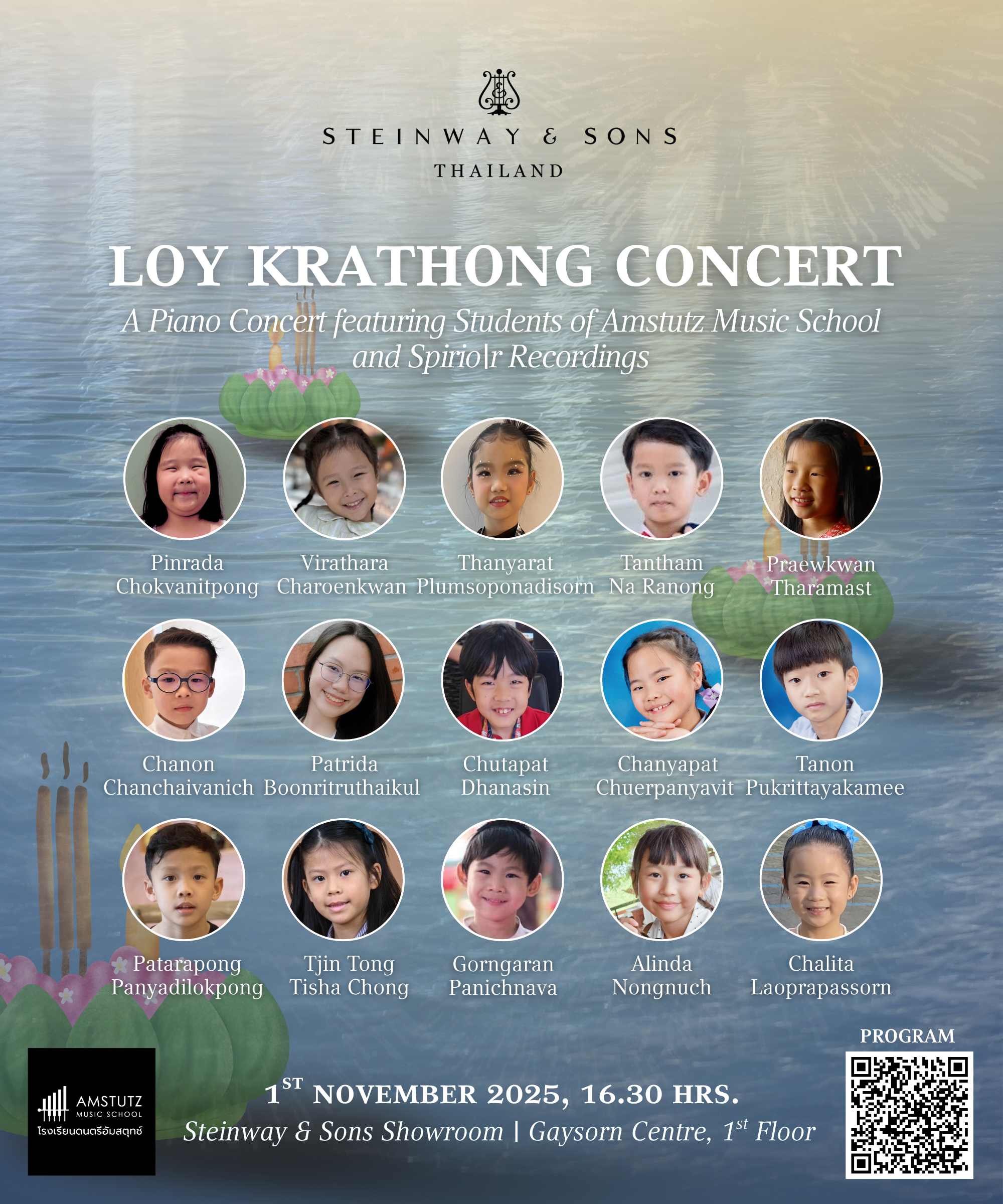 On this special evening, Steinway Thailand and Amstutz Music School join in celebration of the Loy Krathong tradition through Thai melodies, contemporary sound, and the unrivalled artistry of Steinway & Sons.