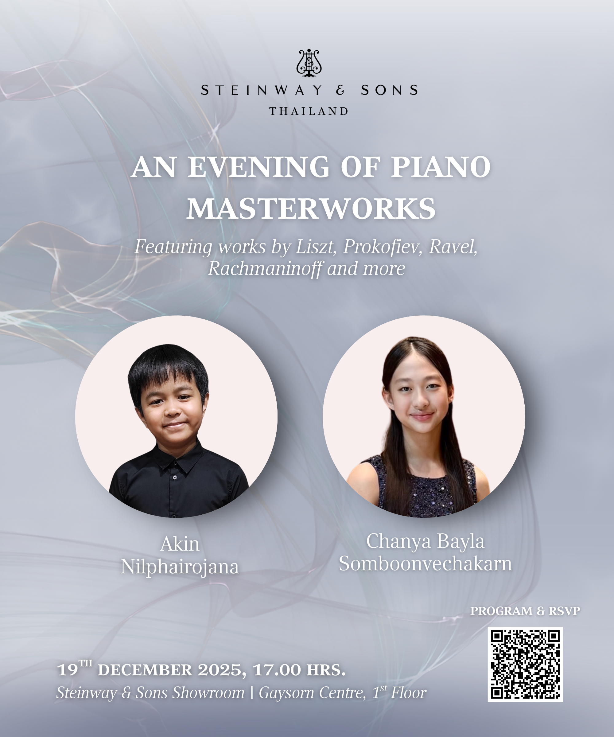 Steinway Thailand is excited to host a special performance by Akin Nilphairojana and Chanya Bayla Somboonvechakarn, two emerging pianists nurtured under the vision and passion of Steinway Artist San Jittakarn.
