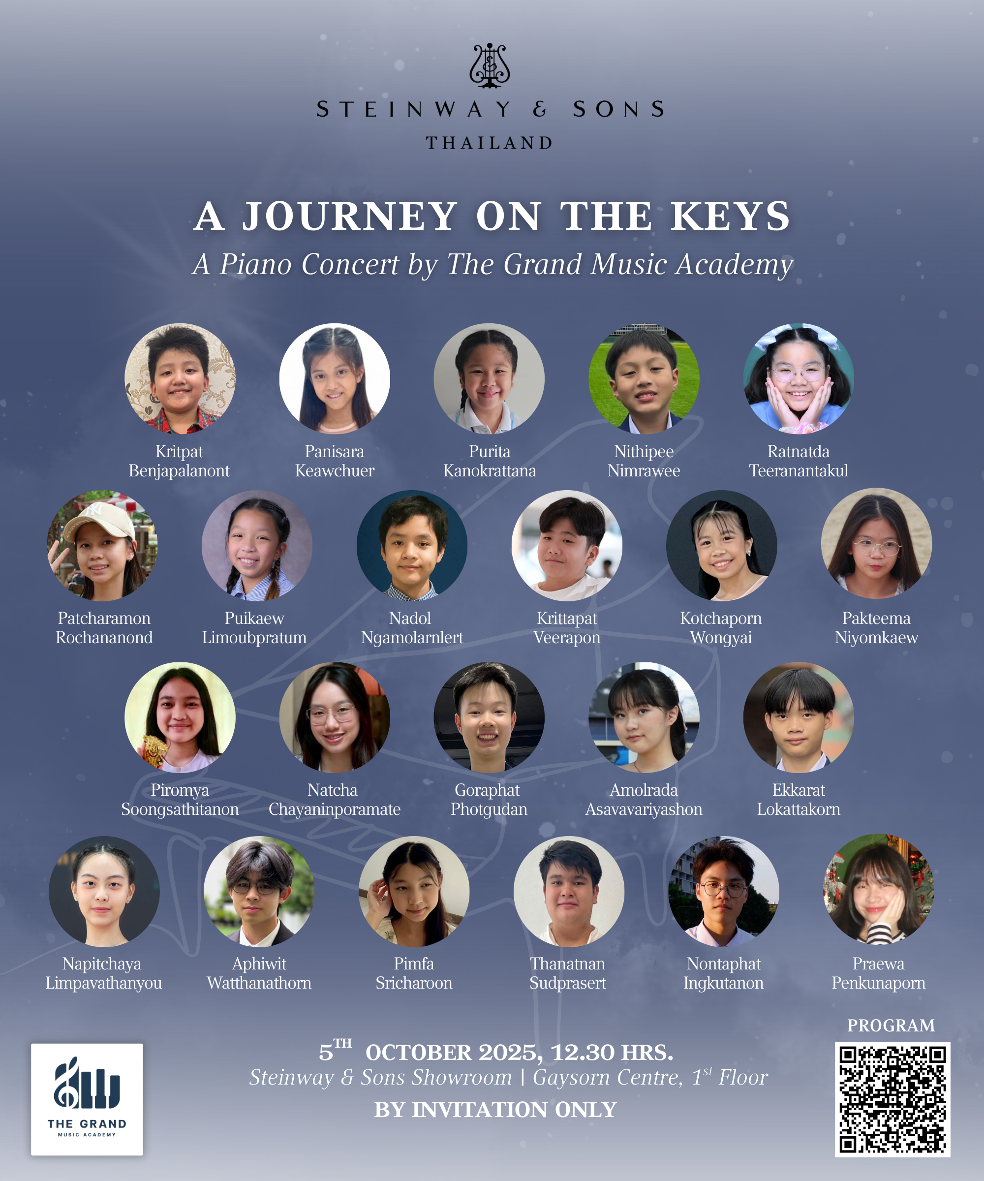 Steinway Thailand is delighted to present “A Journey On The Keys”, a piano concert in collaboration with The Grand Music Academy.