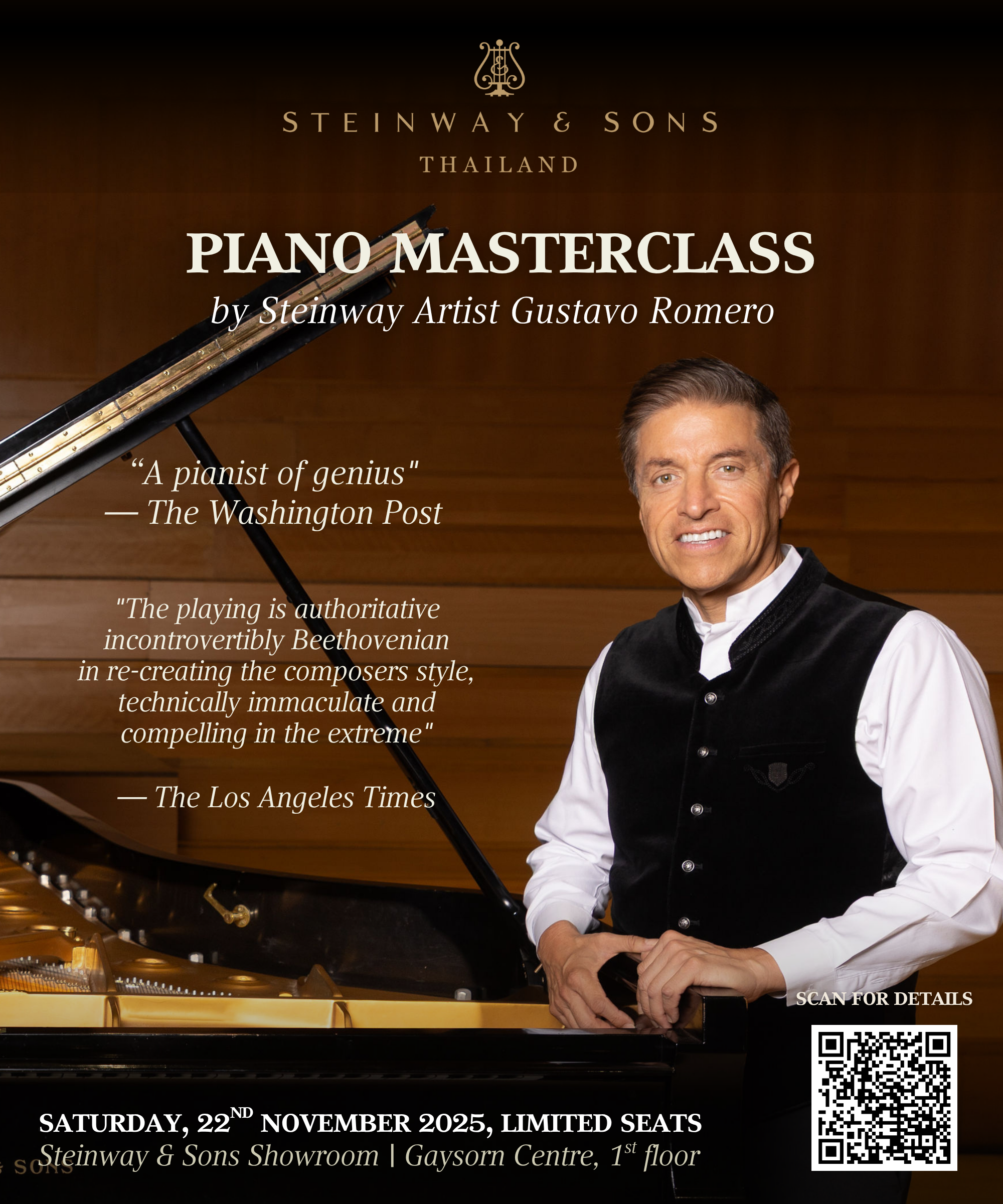 Whether you seek technique refinement or new interpretative insights into your repertoire, this masterclass provides a rare and distinguished opportunity — exclusively at the Steinway & Sons Showroom, Bangkok.