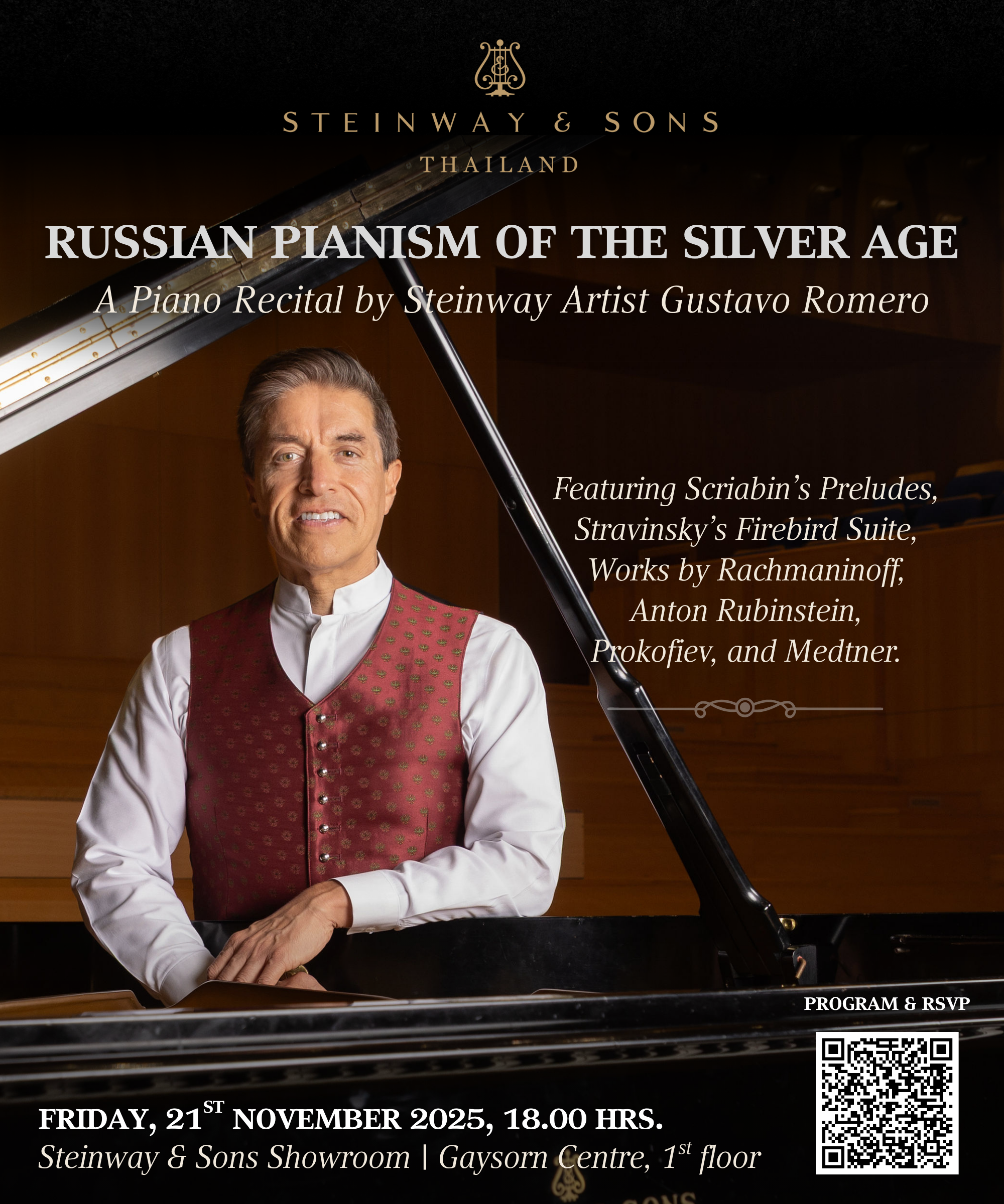 Step into the evocative world of Russia’s Silver Age, a period when music, poetry, and art intertwined to capture the emotional depths of a rapidly changing era. In this solo piano recital, Steinway Artist Gustavo Romero invites audiences on a journey through the vibrant colors and intensity that defined the Russian piano tradition of the early 20th century.