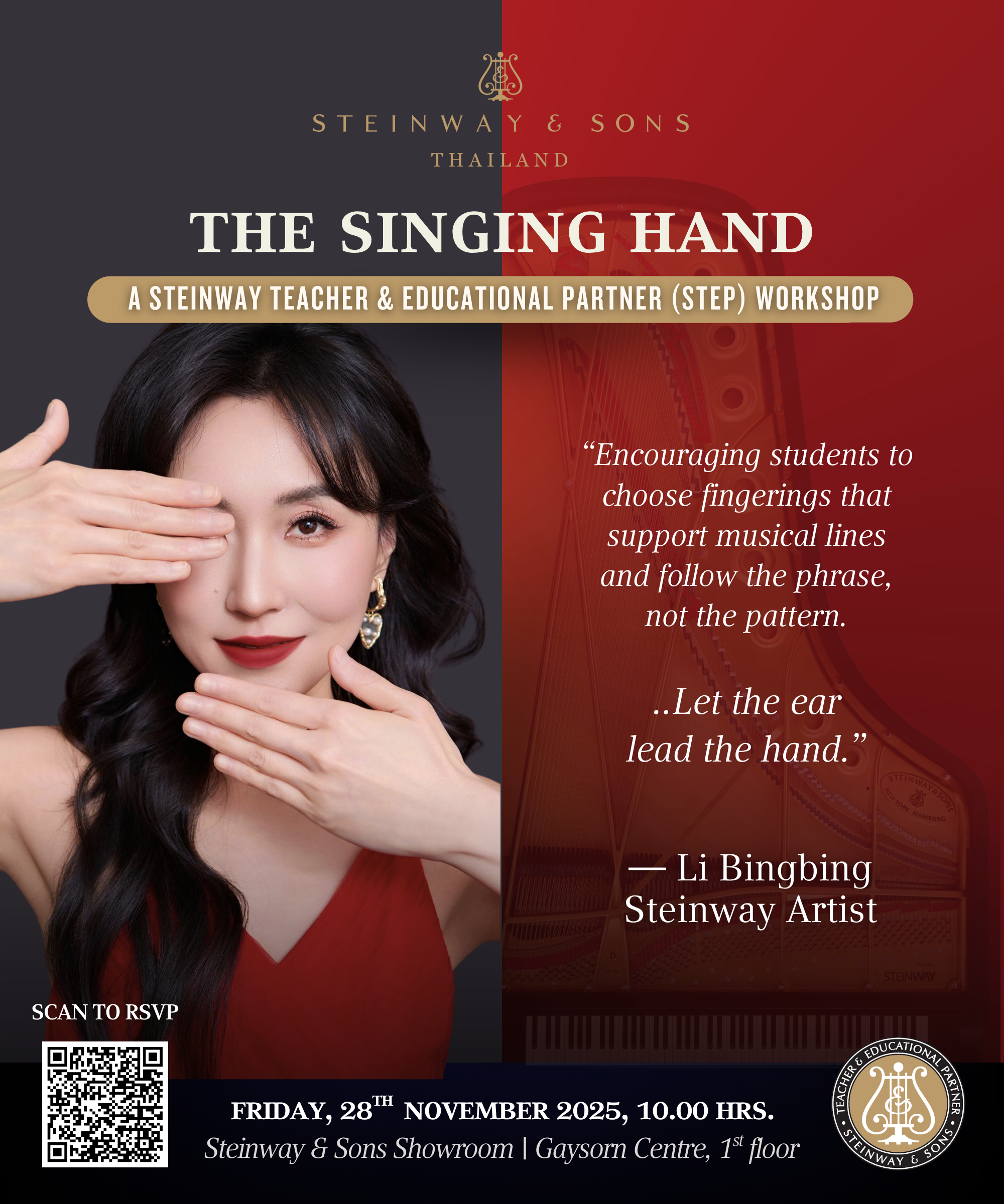 Steinway Thailand invites dedicated piano teachers who strive for technical mastery, and skills in guiding young pianists in developing sustainable fingering choices and techniques suited to their repertoire and individual style.