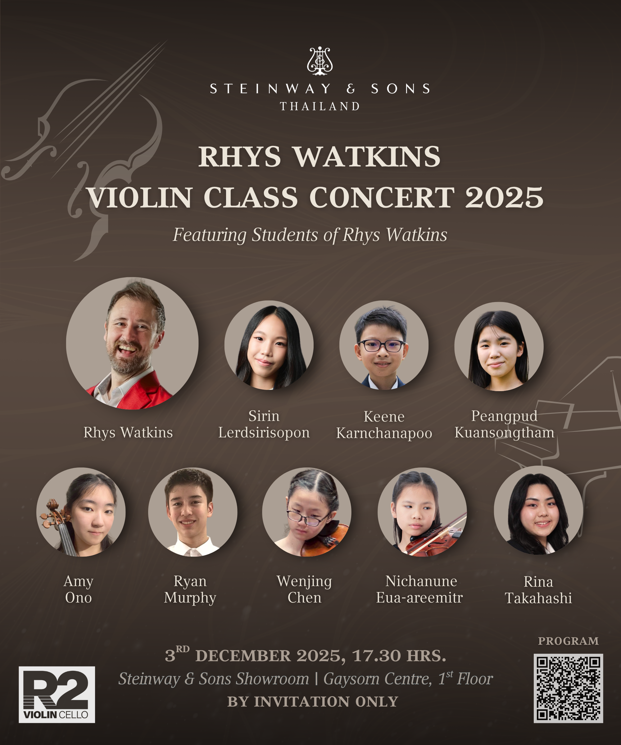 Enjoy a captivating evening of violin and piano music in “Rhys Watkins Violin Class Concert 2025”. This special concert at Steinway & Sons Thailand showcases the talented violin students of Rhys Watkins accompanied on the piano by Rina Takahashi, featuring young performers from Shrewsbury International School Bangkok, and Bangkok Prep International School. The programme includes works by Bach, Seitz, Kreisler, De Falla, Paganini, Tchaikovsky, and Wieniawski, highlighting the artistry and dedication of these emerging musicians.