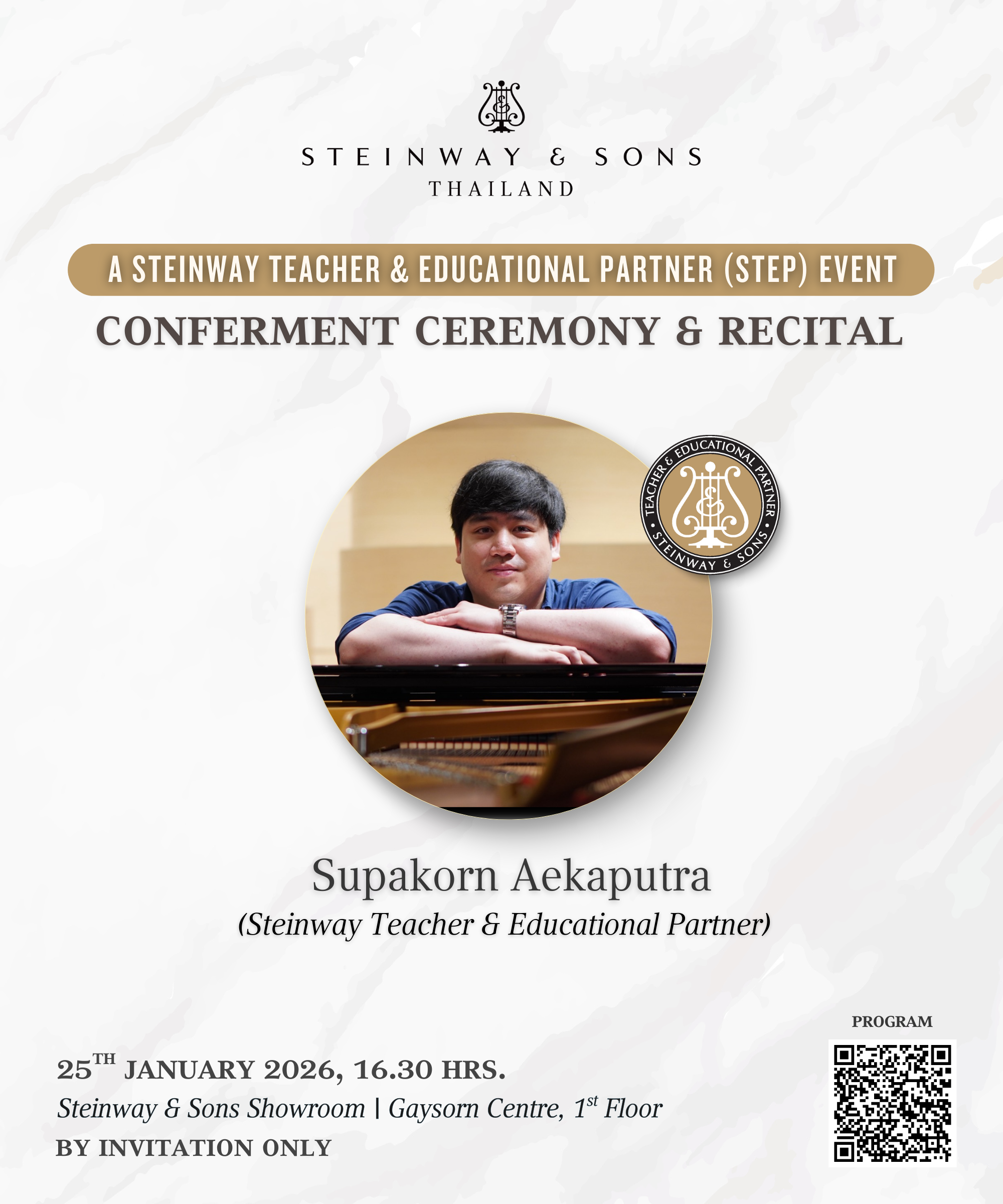 On this remarkable occasion, Steinway Thailand is delighted to celebrate Supakorn Aekaputra’s STEP partner conferment with a recital that reflects his artistry and dedication. The event will conclude with a performance utilizing the Steinway Spirio, highlighting the harmony between inspirational performance and innovative piano technology.